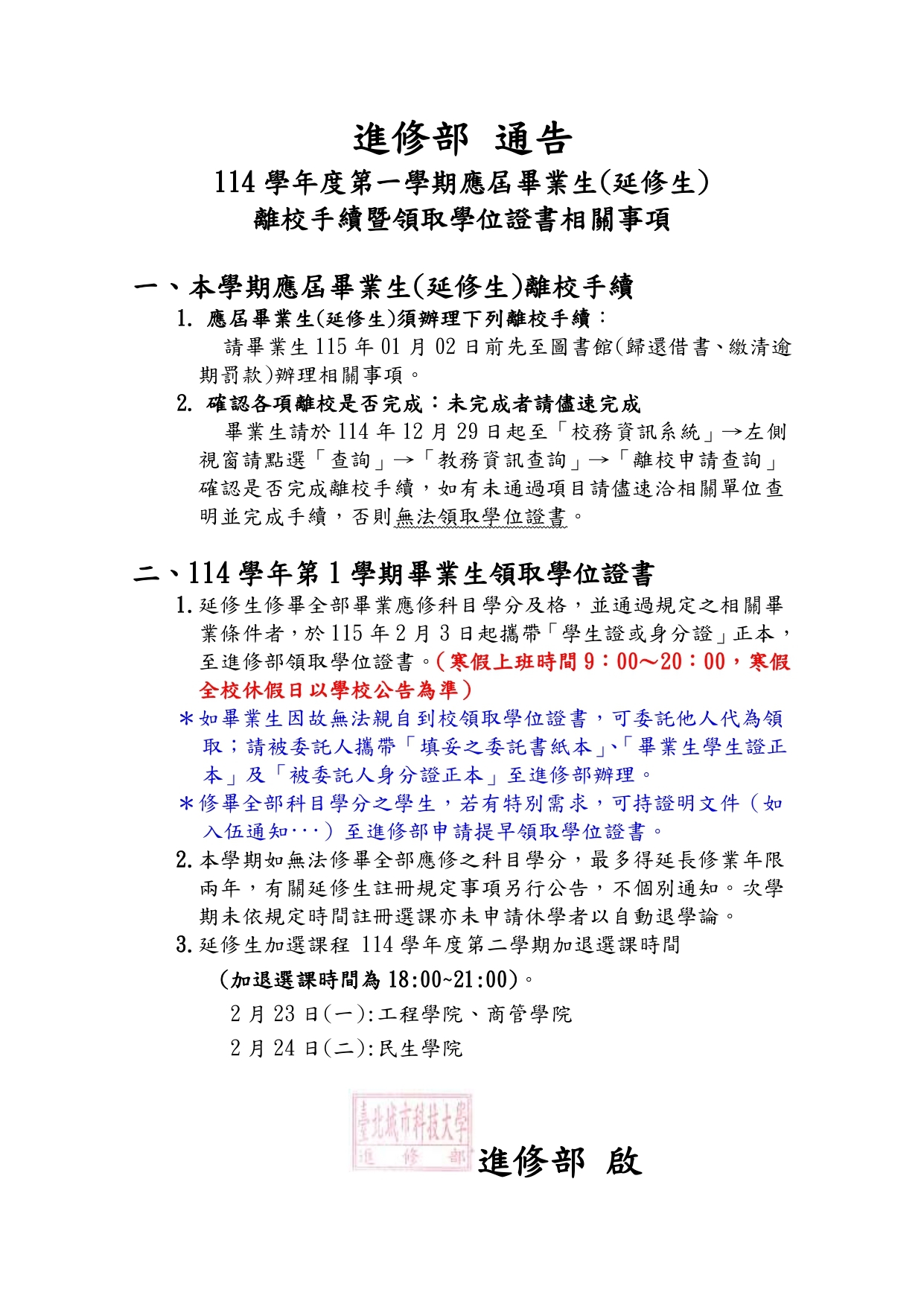 114-1應屆畢業生(延修生)離校相關事項