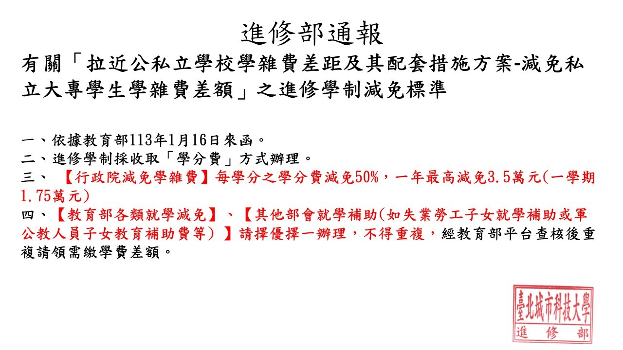 有關「拉近公私立學校學雜費差距及其配套措施方案-減免私立大專學生學雜費差額」之進修學制減免標準