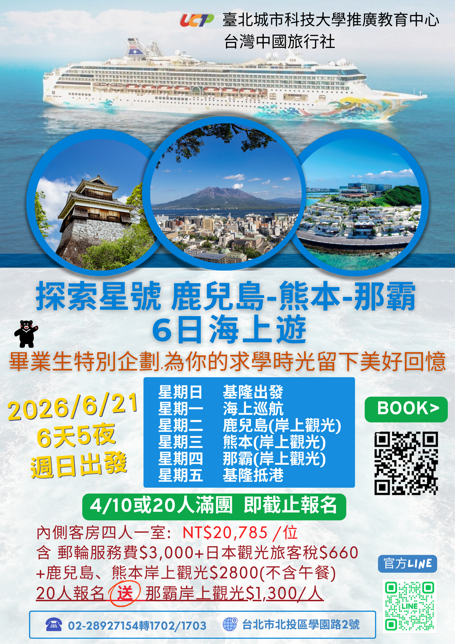 推廣教育--【6月21日探索星號 鹿兒島-熊本-那霸6日海上遊】畢業生企劃專案🚢現正報名中